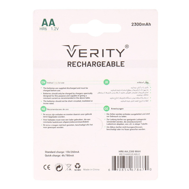 باتری از نوع قلمی AA به تعداد دو عدد در بسته با ظرفیت ۲۳۰۰ میلی آمپر ساعت و ولتاژ برابر با ۱٫۲ ولت