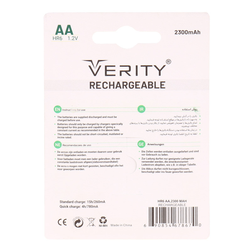 باتری از نوع قلمی AA به تعداد دو عدد در بسته با ظرفیت ۲۳۰۰ میلی آمپر ساعت و ولتاژ برابر با ۱٫۲ ولت